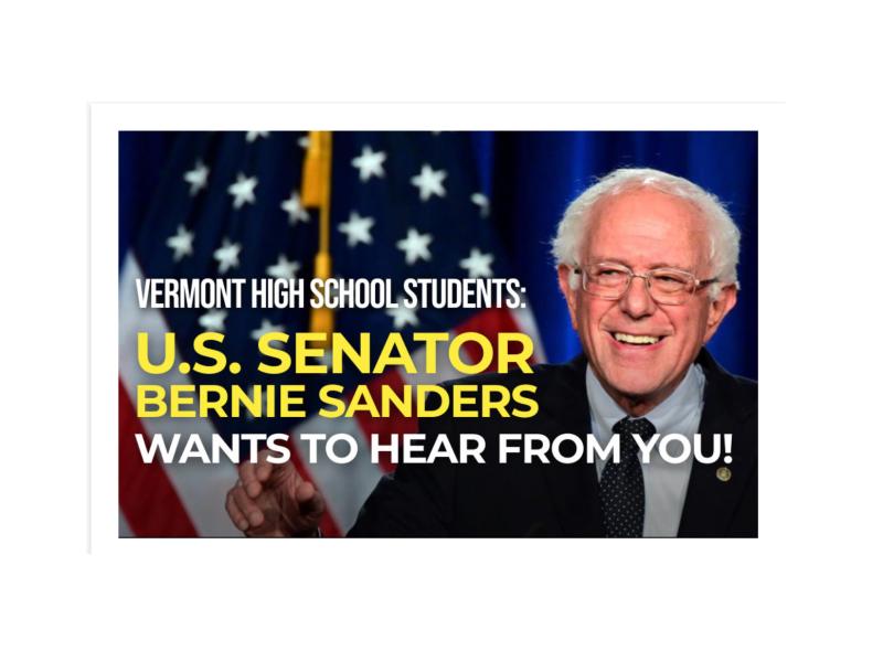 In his 16th annual State of the Union Essay Contest, Vermont Sen. Bernie Sanders invites Vermont high school students to write a 250-500 word essay on a major challenge facing the nation, and how to solve it. Senator Sanders will enter the essays of 15 finalists into the Congressional Record – the official archive of the U.S. Congress. Deadline: Jan. 12, 2026.