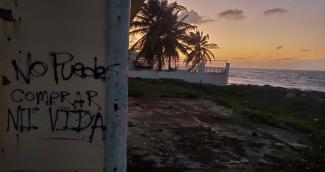 The graffiti on the wall spells out "No puedes comprar mi vida," which means "You cannot buy my life" in Spanish. It is a from the song "Latinoamérica" by Calle 13, and it signifies resilience, independence, and the idea that human dignity, culture, and nature are invaluable and not for sale. This phrase is used to emphasize that one's spirit, identity, and freedom cannot be controlled or purchased by wealth, corporations, or external forces. YOU have every right to be in control of YOUR life, those rights cannot be sold away.