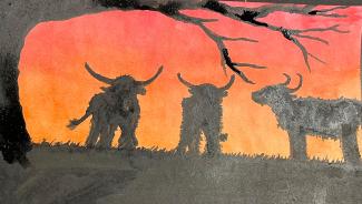 This is a watercolor and ink landscape inspired by my love of cows and sunsets.