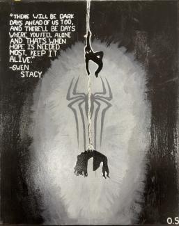 “The Last Thread of Hope” captures a quiet but powerful moment of light and darkness, inspired by The Amazing Spider-Man 2. The Last Thread of Hope is mostly black and white, with a soft glow at the center where a faint spider emblem appears. A thin web runs straight down the canvas, at the top, Spider-Man hangs with one hand, while below, holding Gwen Stacy after a fall, creating a heartbreaking contrast between holding on and letting go.Gwen’s quote sits off to the side, adding a personal, almost human voice to the scene. The strong divide between light and dark mirrors the emotions in The Last Thread of Hope, loss on one side, hope on the other. Even in such a tragic moment, there’s a sense of resilience. It feels like a reminder that, no matter how heavy things get, even the smallest thread of hope can still be there, holding everything together.