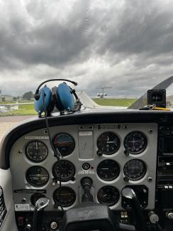 The front seat of a yellow Cessna 172