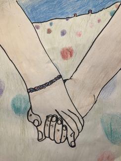 A month ago, I was assigned to make a poster of what makes me happy when I'm down. Immediately, I thought about two things: my best friend and nature. And so, I drew Together: two hands linked together in a beautiful field of colorful flowers. When one falls, the other picks them back up again.