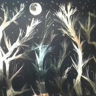 this is a watercolor painting of a bright sunset in the background mixing of all colors with long tree branches that reach over the scenery that show two birds close together to symbol there love with the ground shadowing below.