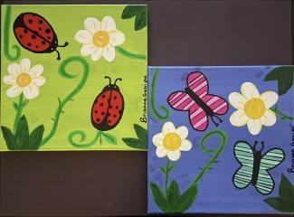 This bright, whimsical painting shows a lively garden full of color and charm. Two canvases sit side by side, each with playful bugs and blooming flowers. One has red ladybugs with bold black spots crawling along curly green vines and white daisies on a sunny green background. The other features soft pink and mint butterflies fluttering across a cool blue sky, surrounded by the same cheerful flowers and swirling stems.
